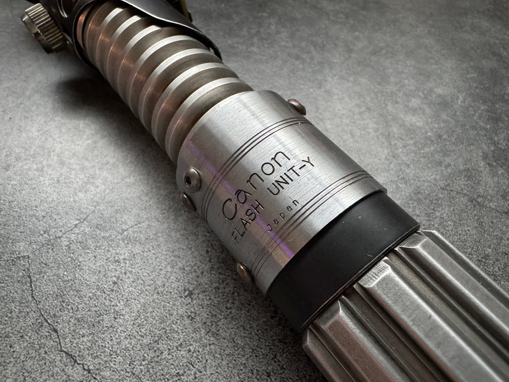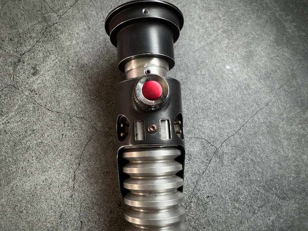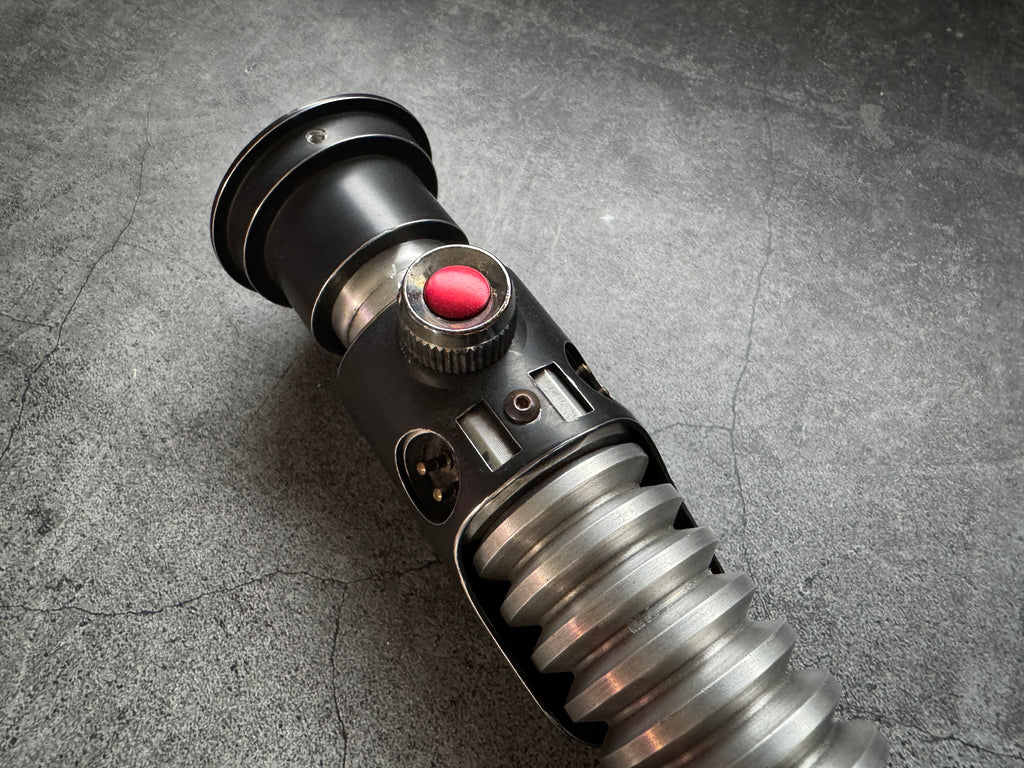 This beauty features nods from several well known character styles, and of course is finished to perfection, both from a greeblie standpoint as well as the overall surface finish. The "call out" features start at the emitter with the stainless steel 7/8" blade adapter, that iconic Canon Y sleeve, and box for activation or simple adornment. The body has approx. 5.5" of interior space which is more than enough for many types of build, with 3" of that space being 28+mm of diameter, perfect for a bass heavy 28mm speaker if placed properly.
