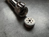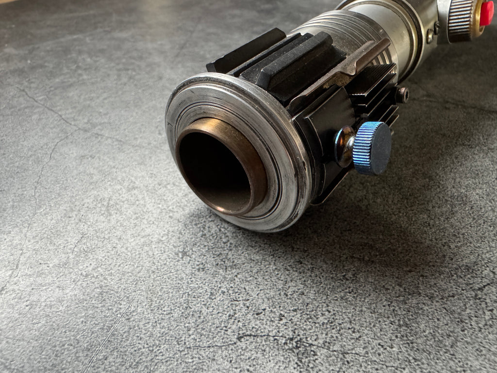 This M Jade styled hilt is like all of Nevins creations, finished to perfection, both from a greeblie standpoint as well as the overall surface finish. The "call out" features start at the heat stained stainless steel 7/8" blade adapter, the real camera part sleeve with the graflex styled red button and the beautifully etched pommel section with kobold d-ring. The body has approx. 6-1/8" of interior space which is more than enough for many types of build, with the entire length of that space being 25.4mm in diameter, perfect for a removable core that utilizes a 24mm speaker. This hilt does have two plunger switches integrated and ready for install.